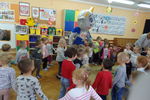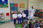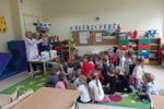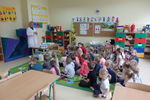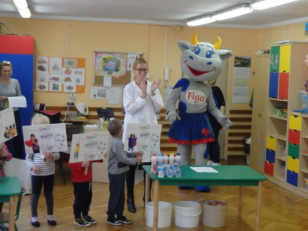 We wtorek 30 października gościliśmy w naszym przedszkolu nietypowego gościa - Krówkę Figę z zakładu mleczarskiego Figand. Spotkanie rozpoczęło się od spotkania z p. Sylwią, która zapoznała dzieci ze zdrowymi produktami żywnościowymi oraz opowiedziała skąd się te produkty biorą i dlaczego codzienne spożywanie nabiału jest dla nich ważne. Następnie dzieci pomagały krówce wybierać dobre i zdrowe produkty w celu kształtowania pozytywnych nawyków żywieniowych. Na koniec spotkania dzieci bawiły się z krówką Figą przy muzyce oraz dostały pyszny serek i kolorowankę.