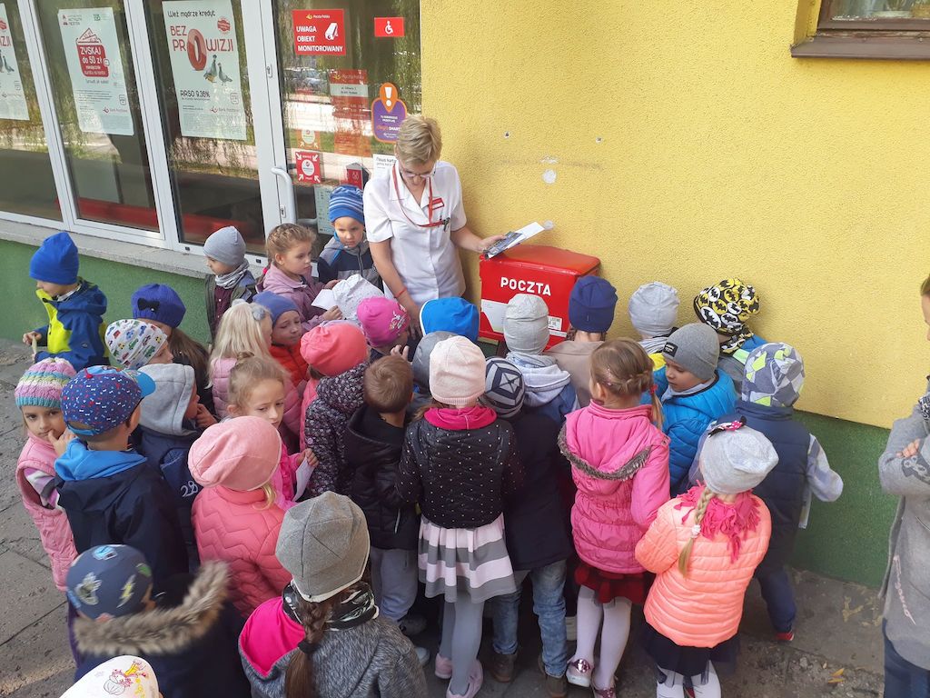 Z okazji Dnia Poczty Polskiej oraz Dnia Listonosza 18.10.2018 r. dzieci z gr. Małych Odkrywców oraz Gwiazdeczek odwiedziły pobliską pocztę. Wcześniej przedszkolaki podczas zajęć dowiedziały się na czym polega praca listonosza. Na poczcie dzieci miały okazję poznać jak wygląda praca na poczcie, a także jak przebiega droga listu od nadania do jego dostarczenia. Podczas wizyty dzieci mogły poszerzyć swoją wiedzę o świecie społecznym oraz utrwalić kulturalne zachowania w miejscach publicznych.